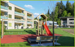 Ein Kinderspielplatz und Rasenfläche